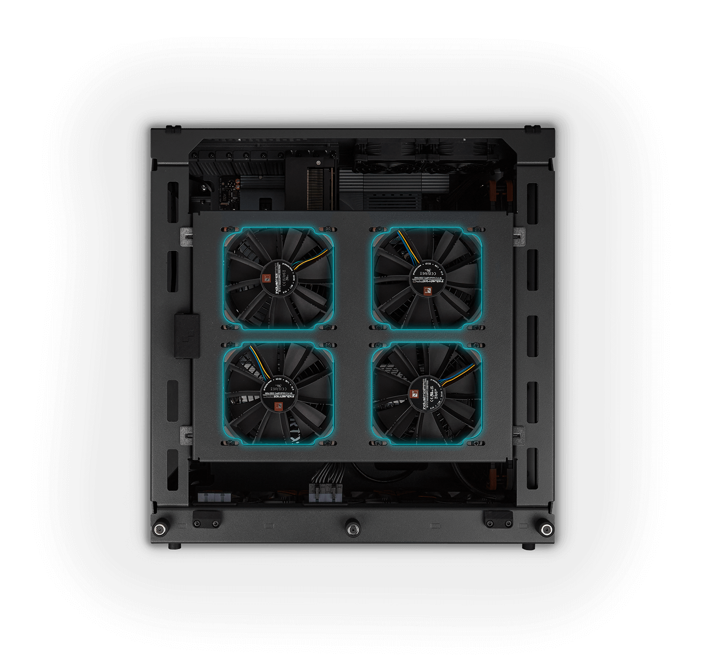 Engineered airflow is directed from front and top fan arrays to deliver high-efficiency, low-noise cooling under sustained load.